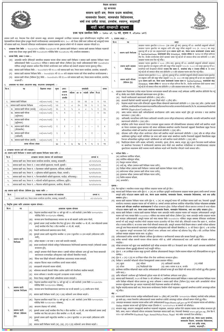 सशस्त्र प्रहरी बलले निरीक्षक पदमा खुला ५४ सहित ९९ जना, सहायक निरीक्षक पदमा खुला ५३ सहित ९८ र परिचर पदमा खुला ५० सहित ९१ जनाका लागि भर्ना खुलाएको हो ।