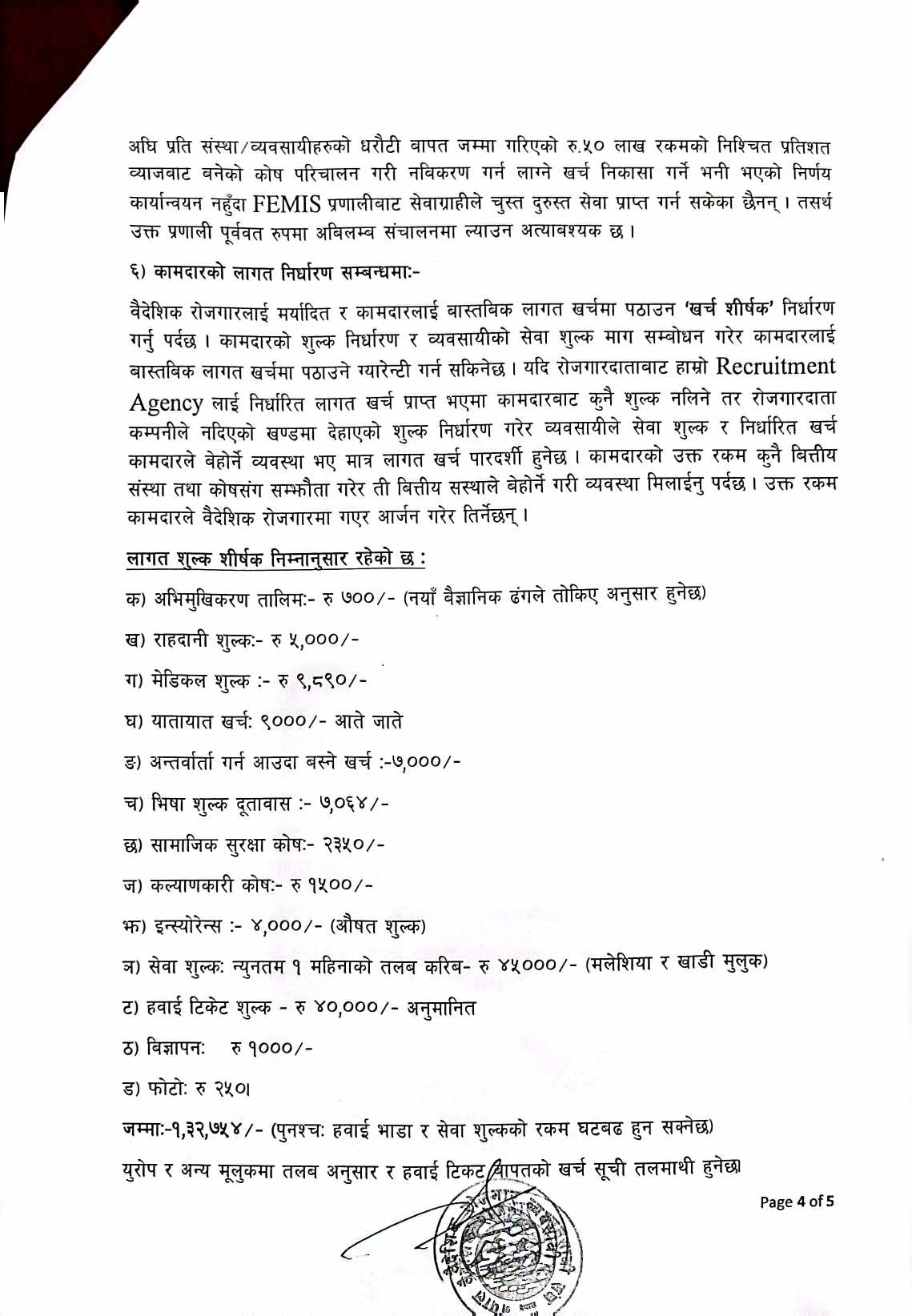 रोजगारदाताबाट Recruitment Agency लाई निर्धारित लागत खर्च प्राप्त भएमा कामदारबाट कुनै शुल्क नलिने उनको भनाइ छ । तर, रोजगारदाता कम्पनीले नदिएको खण्डमा १ लाख ३२ हजार ७५४ रुपैयाँ लागत अनुमान शुल्क लिन पाउनुपर्ने बताए ।