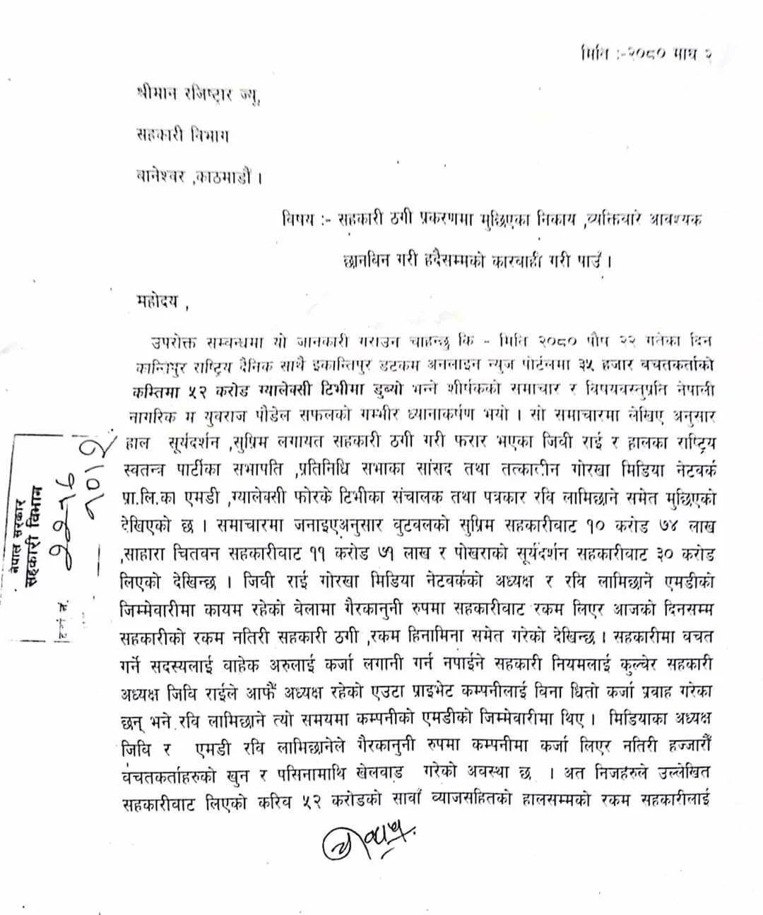 माघ ३, काठमाडौँ | सहकारी ठगी प्रकरणमा जिबी राई र रवि लामिछानेविरुद्ध सहकारी विभागमा उजुरी दर्ता भएको छ । सहकारी ठगी प्रकरणमा गोरखा मिडिया नेटवर्कका अध्यक्ष जिबी राई र तत्कालीन एमडी रविलामिछाने मुछिएको भन्दै आवश्यक छानबिन र कारबाहीको माग गर्दै नेपाली नागरिकका तर्फबाट युवराज सफलले उजुरी दर्ता गराएका हुन् ।
