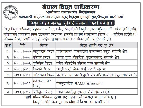नेपाल विद्युत प्राधिकरण, महाराजगञ्ज वितरण केन्द्रअन्तर्गतको विद्युतीय लाइन भूमिगत गर्नुपर्ने भएकाले विद्युत् सेवा अवरुद्ध हुने प्राधिकरणले जनाएको छ ।