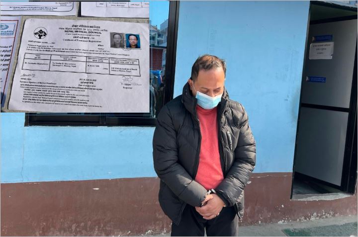 ‘विगत ३ वर्षदेखी काठमाडौं उपत्यकाको विभिन्न पोलिक्लिनिकहरुमा आफूले चीनबाट एमबीबीएस गरी टिचिङ अस्पतालमा काम गर्ने भनि बताई विभिन्न व्यक्तिहरुको नेपाल मेडिकल काउन्सिलको नम्बर प्रयोग गरी नेपाल चिकित्सक संघ र त्रिवि शिक्षण अस्पतालको कार्ड समेत नक्कली बनाई देखाई पोलिक्लिनिकहरुलाई भ्रममा पारी बिरामीहरुको ईलाज गरीरहेका छन् भन्ने विशेष सूचनाको आधारमा यस कार्यालयबाट खटिइ गएको विशेष प्रहरी टोलीले निज व्यक्तिको नगरानी राखी खोजतलास गर्दै जाँदा माघ ७ गते साँझ ४ बजे नियन्त्रणमा लिइएको हो,’ काठमाण्डौं उपत्यका अपराध अनुसन्धान कार्यालयका प्रहरी उपरीक्षक रेग्मीले भने।