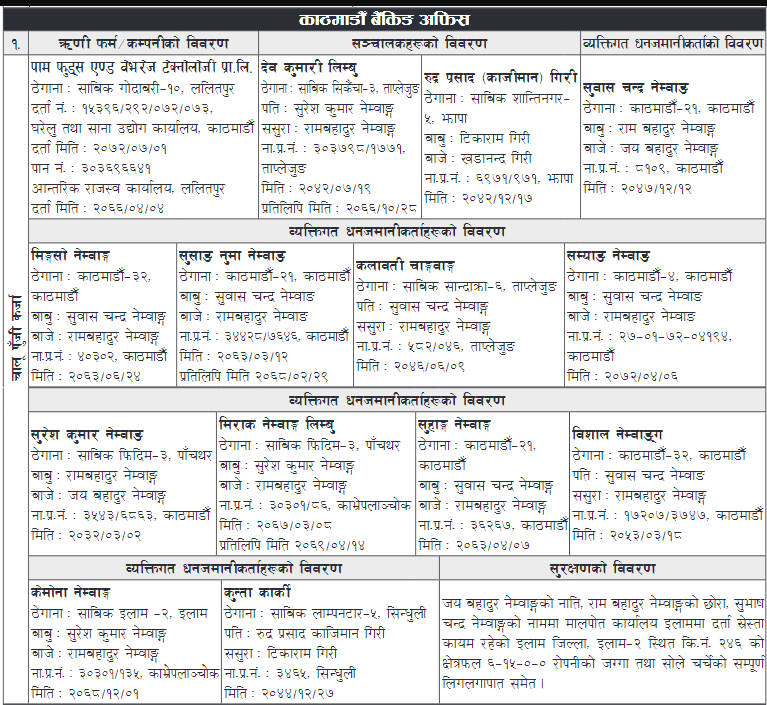 बैंकले नेम्वाङसँगै लिम्बु, गिरी, नेम्वाङका छोरा मिङसो, सम्याङ, भाई सुरेस कुमार, भतिजो मिराक, छोरी सुसाङ सुमा, पत्नी कलावती लगायतको नाममा ३५ दिने सूचना जारी गरेको छ । त्यस्तै व्यक्तिगत जमानीकर्ताको रुपमा सुरेशकी छोरी कोमना नेम्वाङ र सिन्धुलीकी कुन्ता कार्कीको नाममा समेत सूचना जारी गरेको छ ।