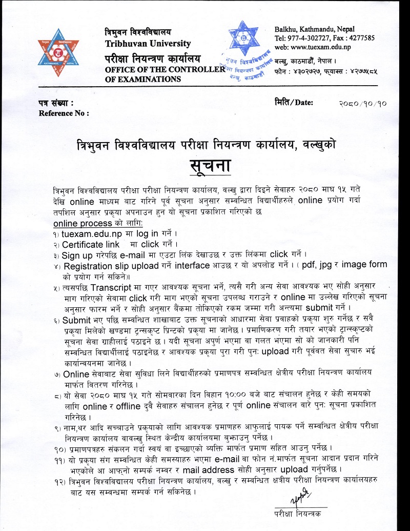 माघ १५, काठमाडौँ | त्रिभुवन विश्वविद्यालयले आजदेखि ट्रान्सक्रिप्टलगायत सेवा अनलाइनबाटै दिने भएको छ । त्रिविको माघ २ गते बसेको केन्द्रीय परीक्षा सञ्चालक समितिको बैठकले आजदेखि ट्रान्सक्रिप्ट, प्रोभिजनल प्रमाणपत्र, पुनर्योग, प्रतिलिपि, करेक्सनलगायत सेवा अनलाइनबाट दिने निर्णय गरेको थियो ।