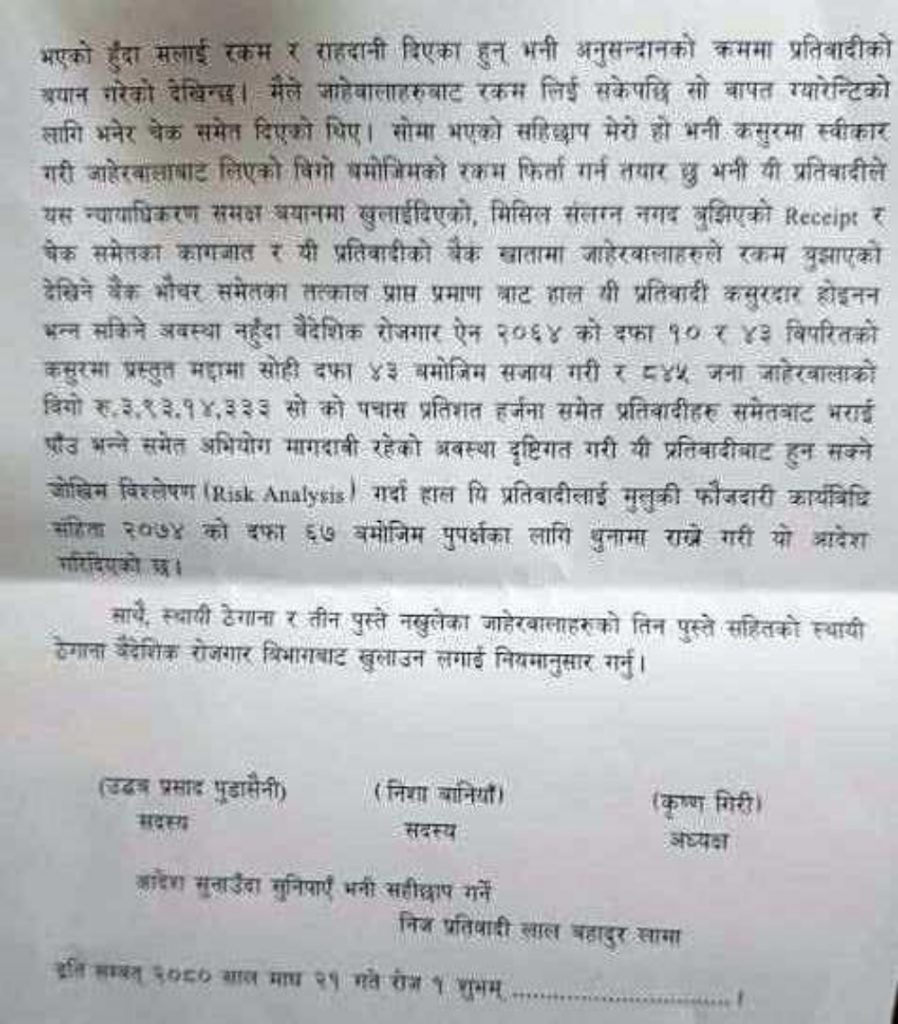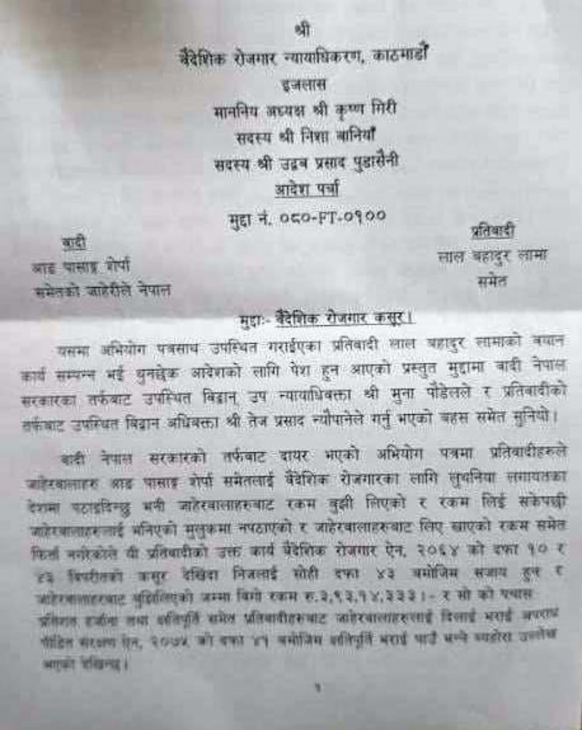 वैदेशिक रोजगार न्यायाधीकरणका अध्यक्ष कृष्ण गिरी, सदस्य निशा बानियाँ र उद्धवप्रसाद पुडासैनीको संयुक्त इजलासले न्यायाधीकरणमा परेको जाहेरीका आधारमा तीन करोड ९३ लाख १४ हजार ३३३ ठगी गरेको गर्ने लामालाई पुर्पक्षमा जेल चलान गर्न आदेश दिएको हो ।