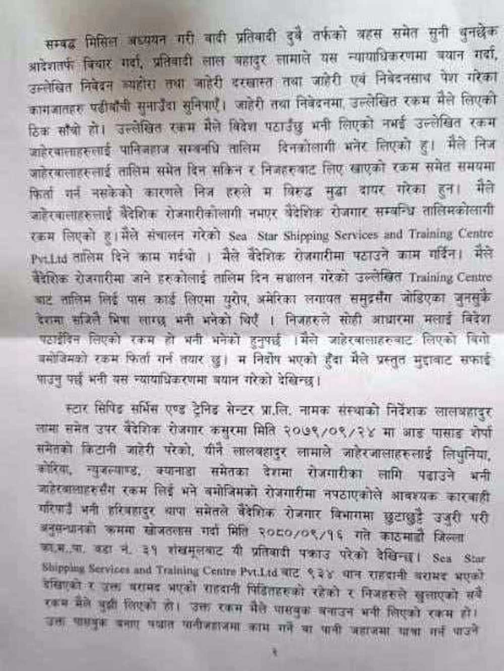 इजलासमा बयान दिने क्रममा लामाले अपराध स्वीकार गरेको तथा प्राप्त प्रमाणबाट उनी कसुरदार ठहर भएको भन्दै मुलुकी फौजदारी कार्यविधि संहिता २०७४ को दफा ६७ बमोजिम पुर्पक्षका लागि थुनामा राख्न आदेश दिएको वैदेशिक रोजगार न्यायाधीकरणका सूचना अधिकारी सुशीला पाण्डेले जानकारी दिइन् ।