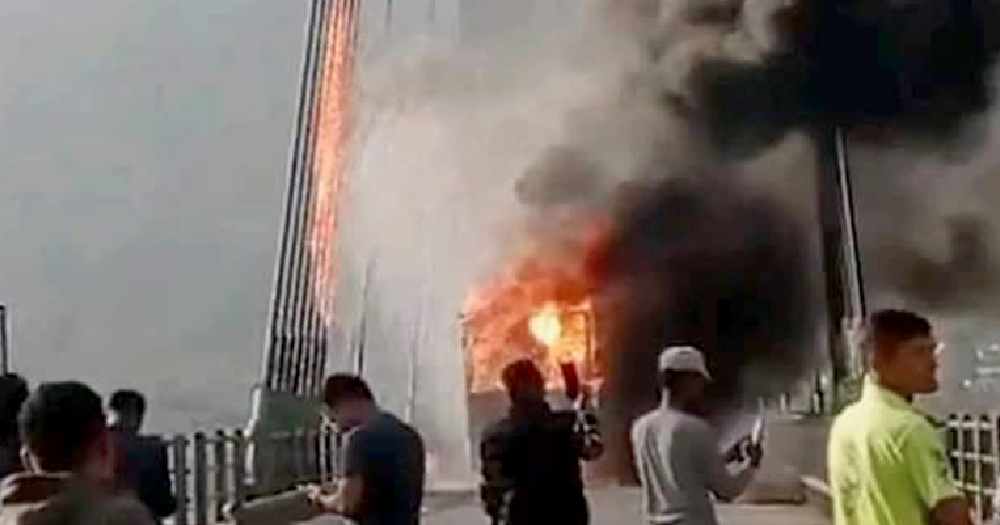 कर्णाली पुलमा गुडिरहेकाे ट्रकमा आगलागी, पुलका केही लठ्ठामा क्षति