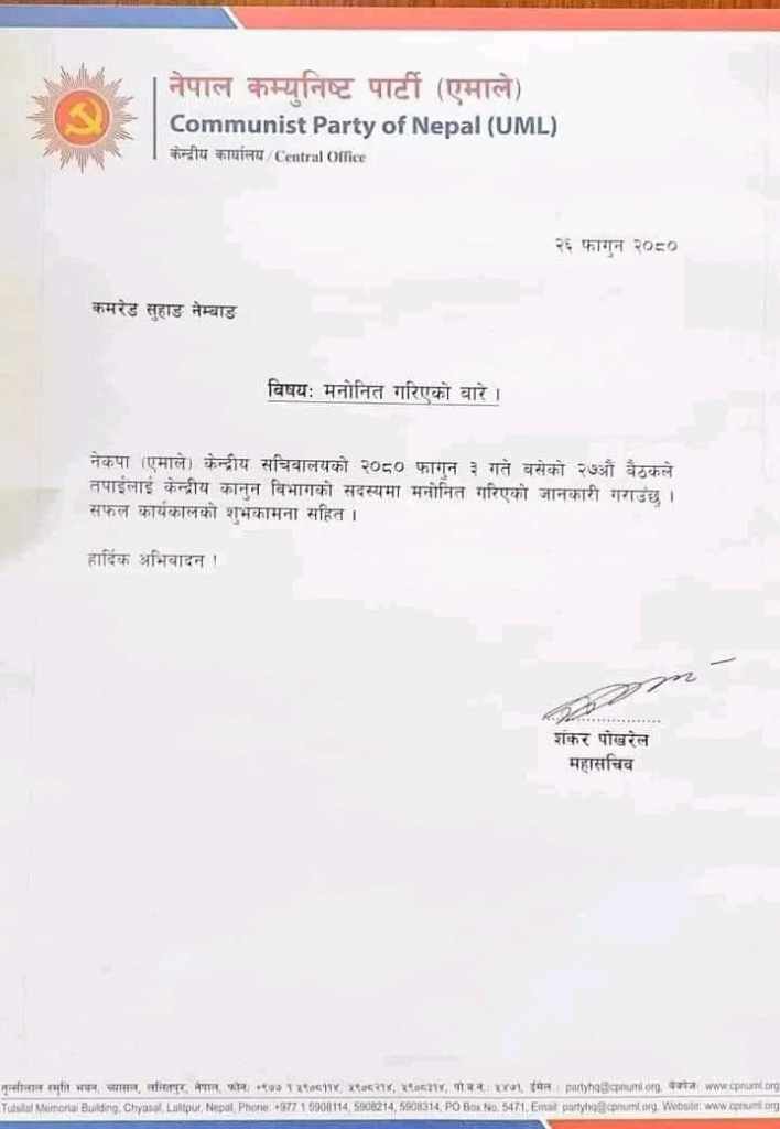 फागुन ३०, बिराटनगर | नेकपा एमालेले संविधान सभा अध्यक्ष स्वर्गीय सुवास नेम्वाङका पुत्र अधिवक्ता सुहाङ नेम्वाङलाई केन्द्रीय कानून विभागको सदस्यमा मनोनीत गरेको छ ।