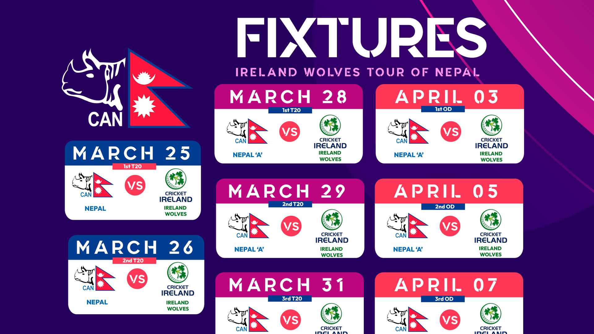 नेपाल क्रिकेट संघ (क्यान)ले शुक्रबार आयरल्याण्ड वल्भ्सको आगामी नेपाली भ्रमणको तालिका सार्वजनिक गरेको हो। आयरल्याण्डले नेपालमा कुल ८ खेल खेल्नेछ।