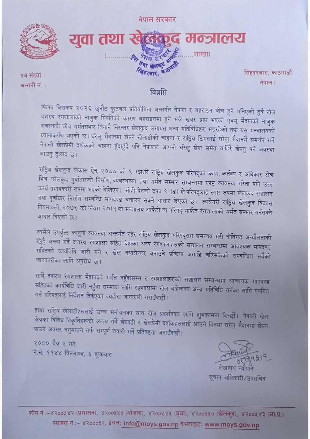 मन्त्रालयले शुक्रबार एक विज्ञप्ति जारी गर्दै दशरथ रंगशालासहित देशका अन्य रंगशालाहरु संचालनको कार्यविधि छिटै जारी गर्ने तयारी भैरहेको जानकारी दिदै कार्यविधि जारी नहुन्जेल खेलकुद बाहेकका गतिबिधि संचालन नगर्न राष्ट्रिय खेलकुद परिषदलाई निर्देशन दिएको हो।