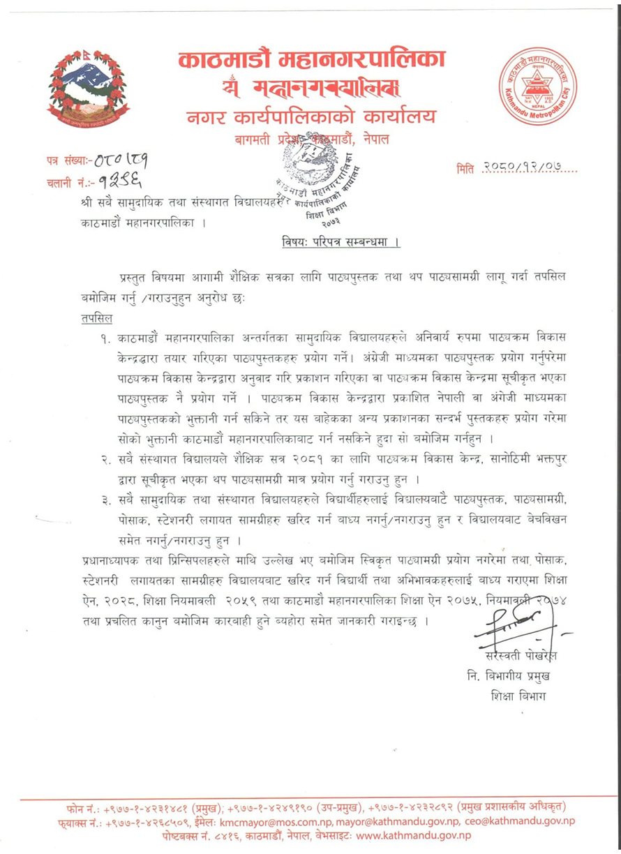 उक्त परिपत्र अनुसार अब सामुदायिक विद्यालयहरुले पाठ्यक्रम विकास केन्द्रले तयार पारेका पाठ्यपुस्तक मात्र प्रयोग गर्न पाउनेछन् । अंग्रेजी माध्यमका पाठ्यपुस्तक प्रयोग गर्नु परेमा केन्द्रले अनुवाद गरेर प्रकाशन गरेका वा सूचीकृत भएका मात्र प्रयोग गर्नुपर्नेछ । यसवाहेकका पाठ्यपुस्तकका लागि महानगरपालिकाले भुक्तानी गर्दैन ।