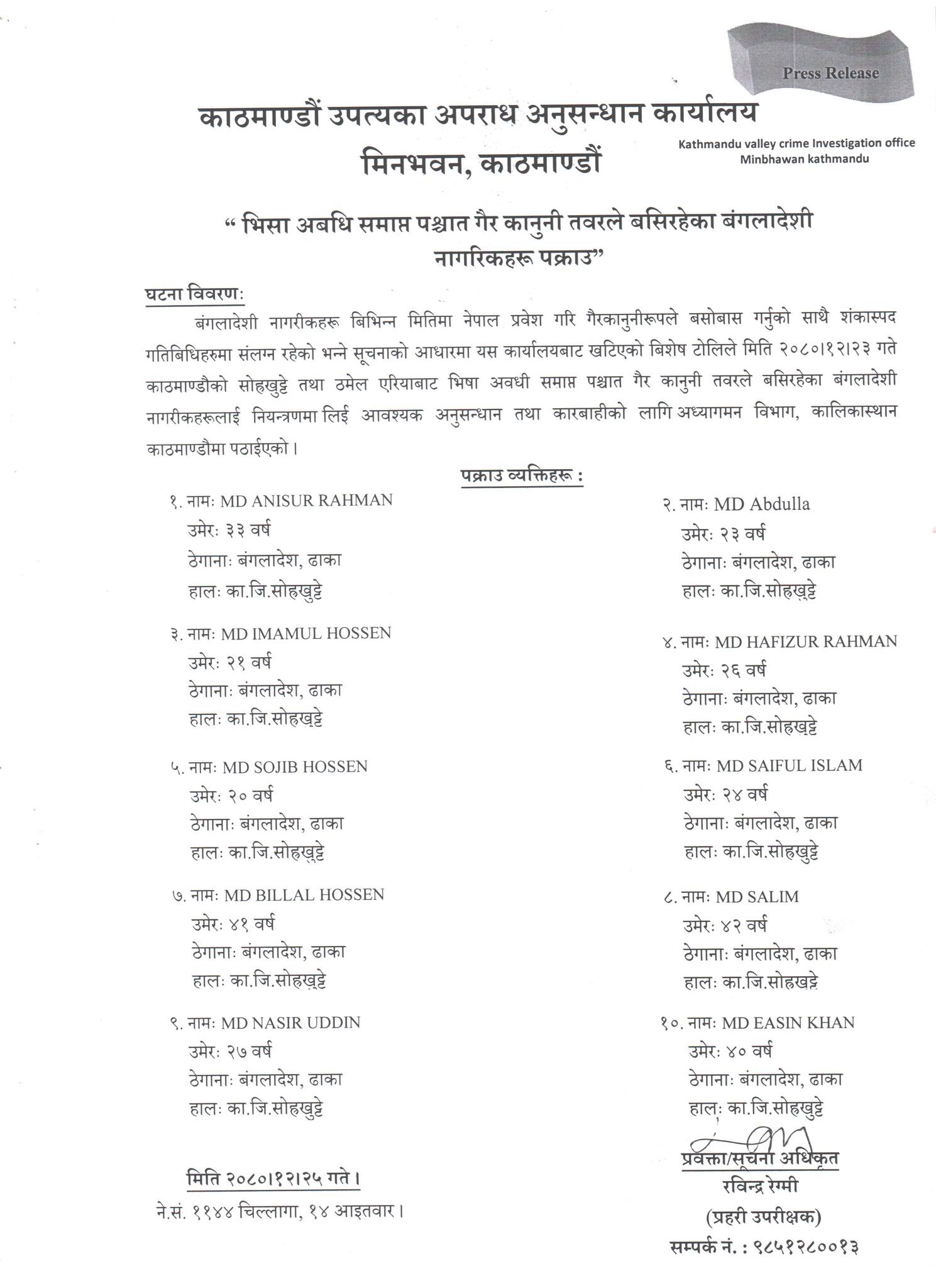 चैत २५, काठमाडौँ । भिसा अवधि समाप्त भएपछि पनि नेपालमा बसिरहेका १० जना बंगलादेशी नागरिकहरूलाई प्रहरीले पक्राउ गरेको छ ।