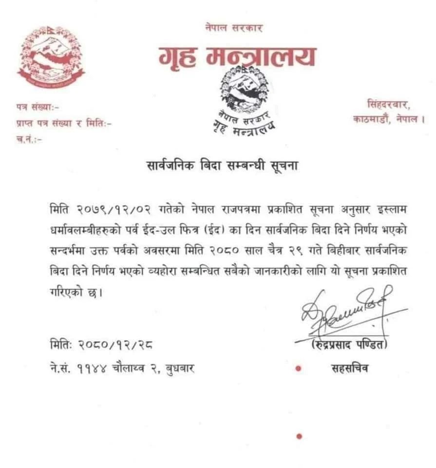 इस्लाम धर्मावलम्बीहरूको पर्व ईद उल (ईद) फित्रको अवसरमा सार्वजनिक बिदा दिने निर्णय अनुसार बिहीबार सो बिदा दिइएको गृह मन्त्रालयले जारी गरेको सूचनामा भनिएको छ ।
