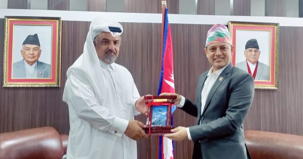 बैशाख ४, काठमाडौँ । श्रम, रोजगार तथा सामाजिक सुरक्षामन्त्री डोलप्रसाद अर्याल र नेपालका लागि कतारका राजदूत मिशाल विन मोहम्मद एलएई अन्सारीबिच शिष्टाचार भेट भएको छ।