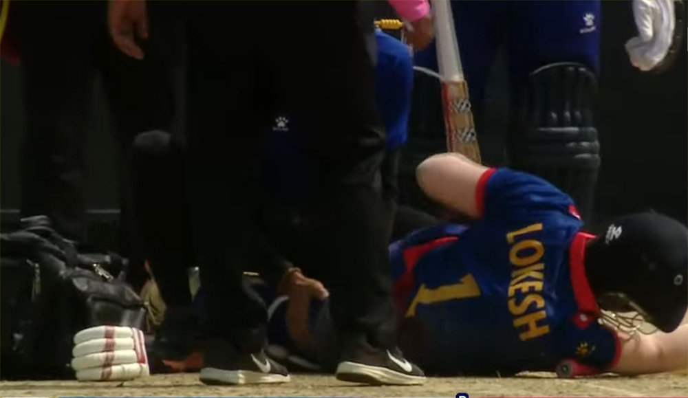 बैशाख १६, काठमाडौँ । नेपालका ब्याट्सम्यान लोकेस बम ब्याटिंगका क्रममा घाइते भएका छन् ।
