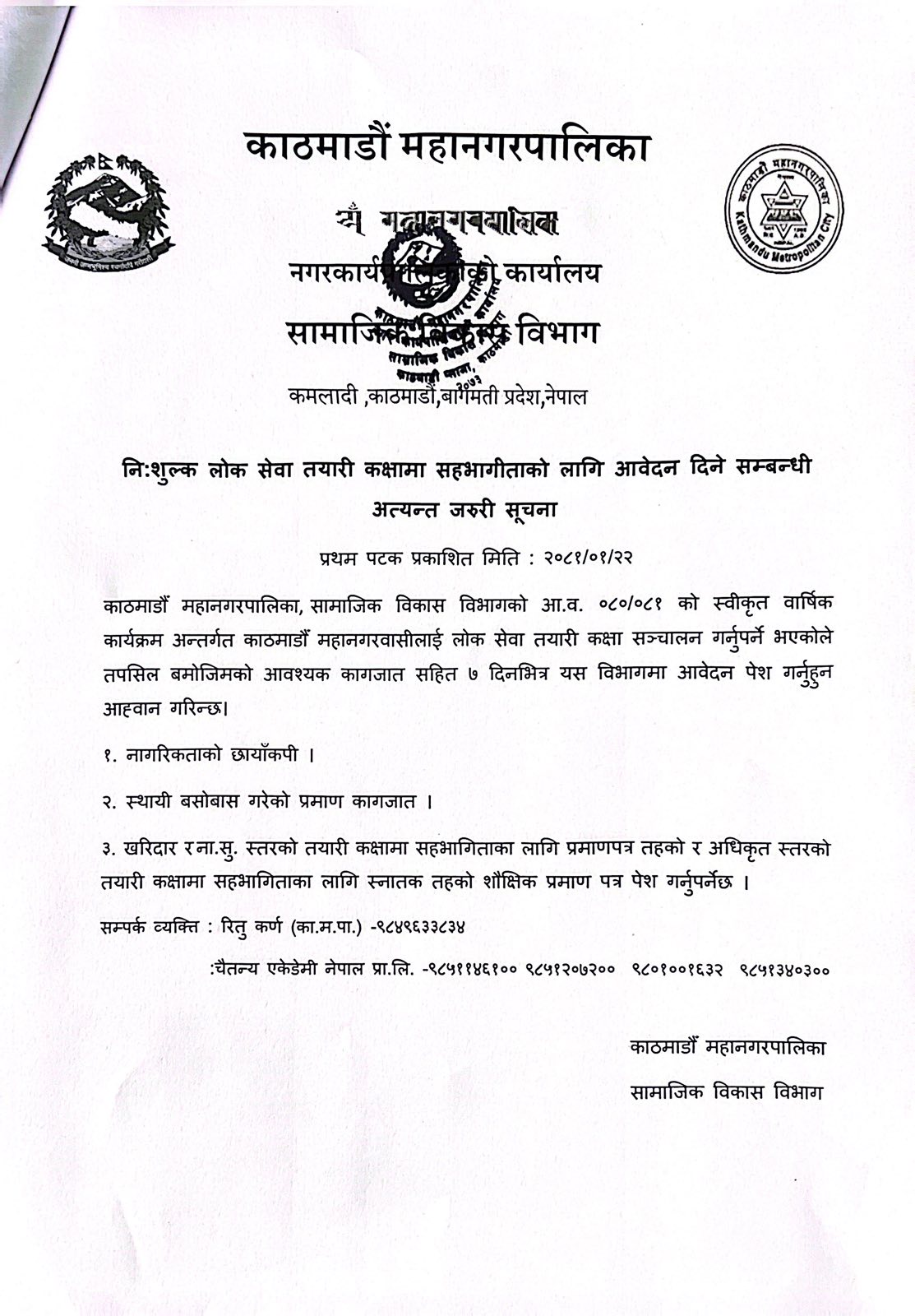 उक्त सूचनामा भनिएको छ– ‘काठमाडौं महानगरपालिका, सामाजिक विकास विभागको आर्थिक वर्ष ०८०\०८१ को स्वीकृत वार्षिक कार्यक्रम अन्तर्गत काठमाडौं महानगरवासीलाई लोक सेवा तयारी कक्षा सञ्चालन गर्नुपर्ने भएको तपसिल बमोजिमको आवश्यक कागजातसहित ७ दिनभित्र यस विभागमा आवेदन पेश गर्नुहुन आह्वान गरिन्छ ।’