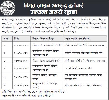 कुलेश्वर वितरण केन्द्र, कीर्तिपुर वितरण केन्द्र र जोरपाटी वितरण केन्द्रहरू अन्तर्गतका विद्युतीय वितरण लाइन भूमिगत गर्न लागिएकोले विद्युत् सेवा प्रभावित हुने भएको हो ।