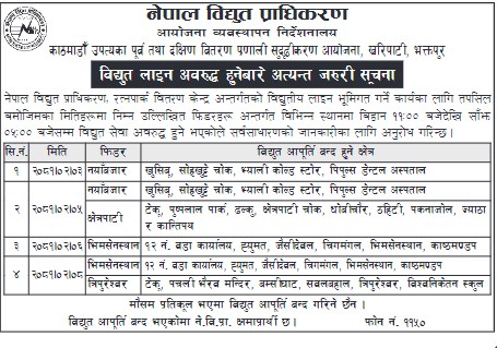 प्राधिकरणले जेठ ३ गते नयाँबजार, जेठ ५ गते नयाँबजार र क्षेत्रपाटी, जेठ ६ गते भिमसेनस्थान र जेड ८ गते भिमसेनस्थान र त्रिपुरेश्वर क्षेत्रमा विद्युत् सेवा अवरुद्ध हुने जानकारी दिएको छ ।