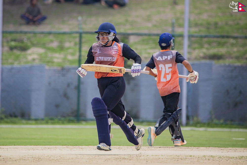 जेठ २, काठमाडौँ । शसस्त्र प्रहरी बलको (एपिएफ) क्लब ललितपुर मेयरर्स कप क्रिकेटको फाइनलमा पुगेको छ । बुधवार भएको खेलमा आयोजक ललितपुर मेयर्स–११ लाई पराजित गर्दै एपिएफ फाइनलमा पुगेको हो ।