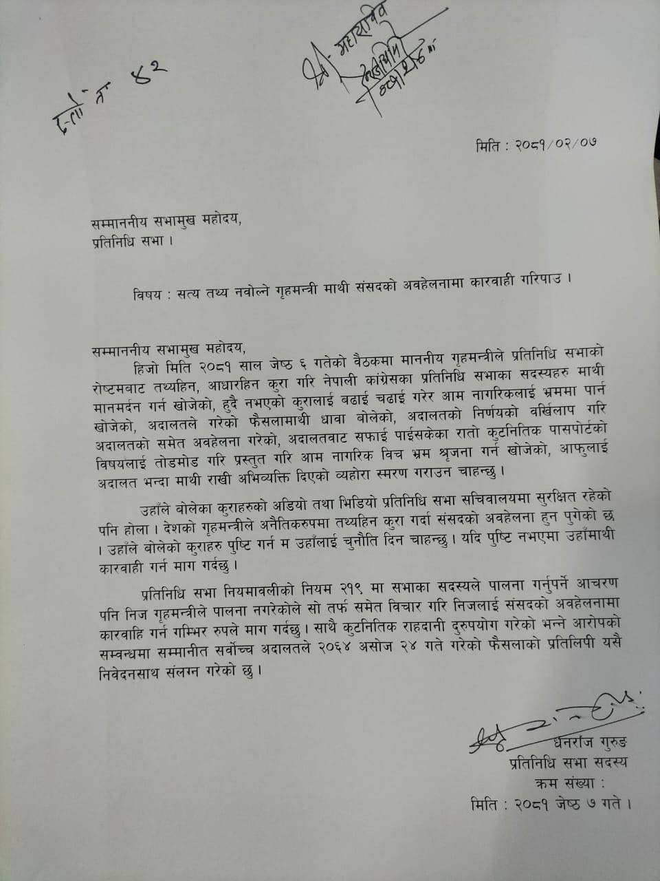 सभामुख देवराज घिमिरेलाई सम्बोधन गर्दै उपसभापति गुरूङले सोमबार निवेदन दिएका हुन्। उपसभापति गुरूङले 'सत्यतथ्य नबोल्ने गृहमन्त्रीमाथि संसदको अवहेलनामा कारबाही गर्न' मागसहित निवेदन दिएका छन्।