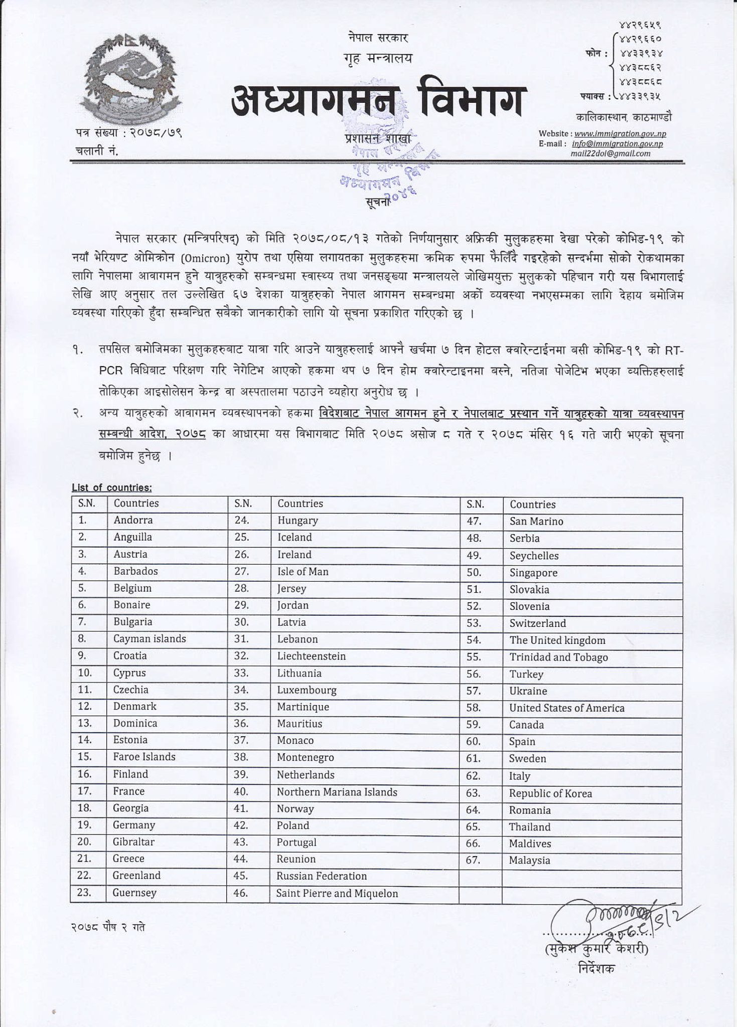 नेपाल सरकार, मन्त्रीपरिषदको मङ्सिर १३ गतेको निर्णय अनुसार नयाँ निर्णय गरिएको अध्यागमन विभागले जानकारी दिएको छ । अध्यागमन विभागले ओमिक्रोन फैलिएका ६७ मुलुकबाट नेपाल आउने यात्रुलाई सात दिन अनिवार्य क्वारेन्टिनमा बस्नुपर्ने बताएको छ । उनिहरुले आफ्नै खर्चमा क्वारेनटाइन बस्नुपर्ने छ । क्वारेनटाइनपछि पीसीआर परीक्षण गरि नेगेटिभ आएको खण्डमा थप ७ दिन होम क्वारेनटाइन बस्नुपर्ने निर्णयमा उल्लेख छ ।