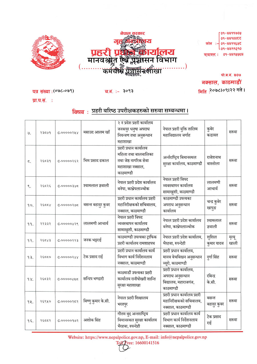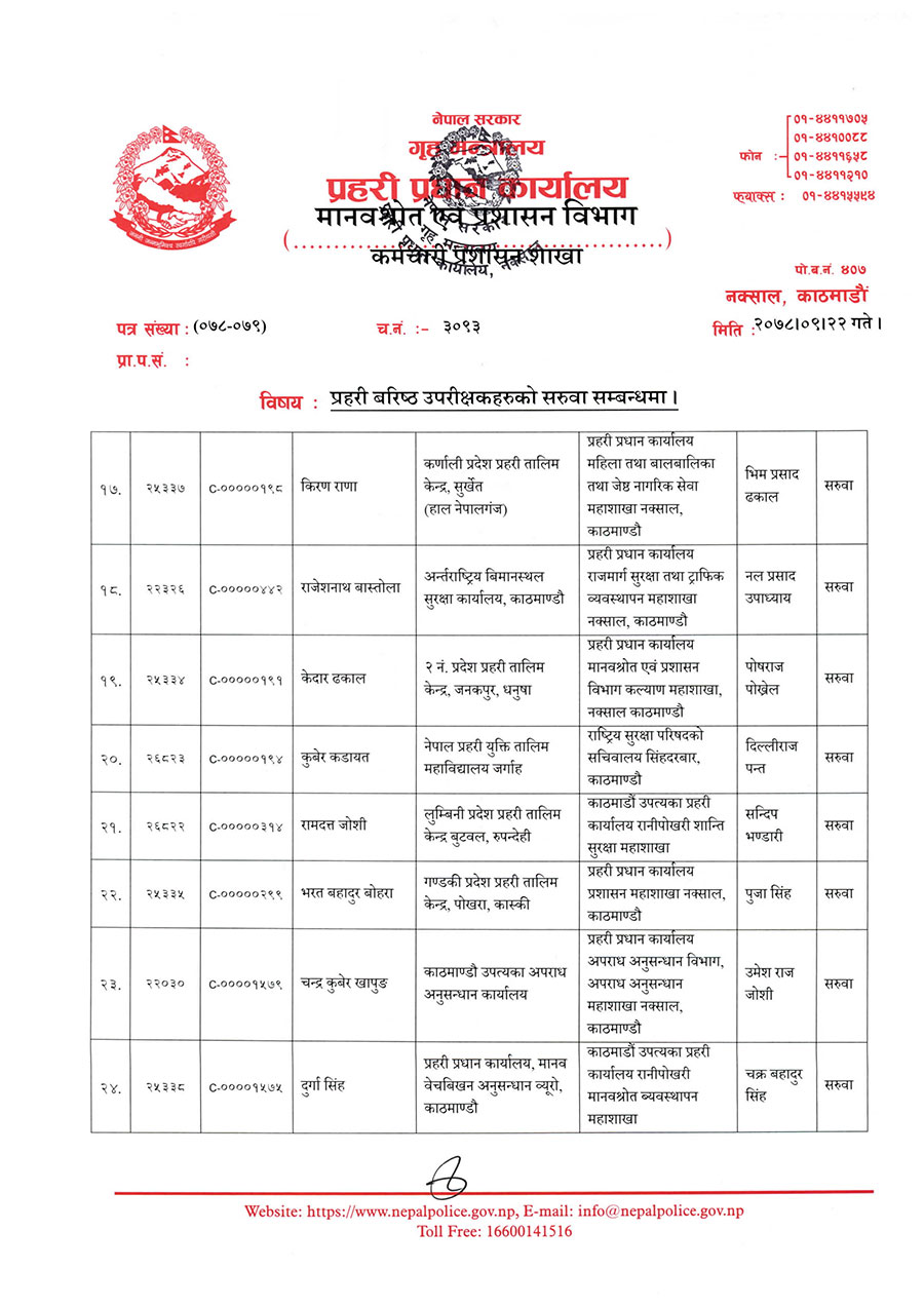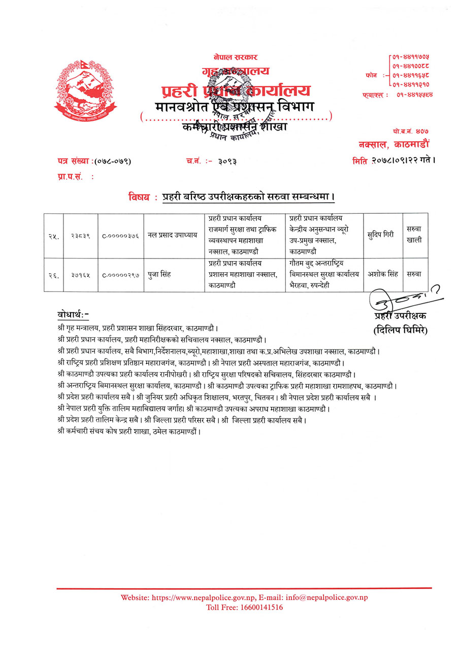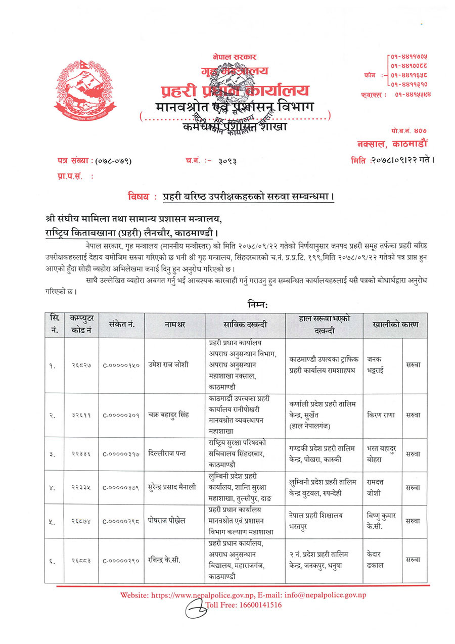 त्यस्तै श्यामलाल ज्ञवालीलाई विपद व्यवस्थापन कार्यालय सामाखुसीमा, बसन्त बहादुर कुँवरलाई अपराध अनुसन्धान कार्यालयमा, चन्द्र कुवेर खापुङलाई अपराध अनुसन्धान विभागमा, नल प्रसाद उपाध्यायलाई केन्द्रीय अनुसन्धान व्यूरो उपप्रमुख नक्सालमा, भिमप्रसाद ढकाललाई अन्तर्राष्ट्रिय विमानस्थल सुरक्षा कार्यालयमा र पुजा सिंहलाई गौतमबुद्ध अन्तर्राष्ट्रिय विमानस्थल सुरक्षा कार्यालय भैरहवामा सरुवा गरिएको छ ।