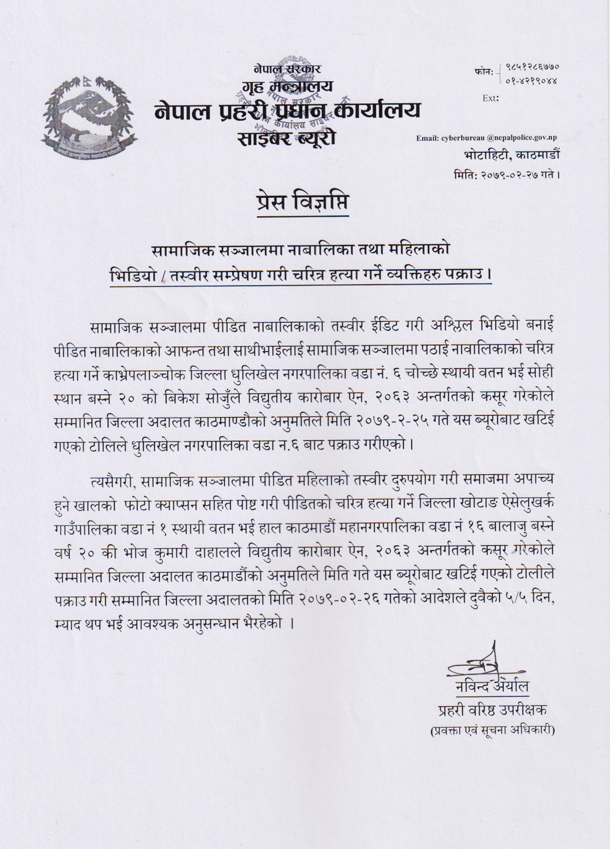 यस्तै महिलाको तस्बि दुरुपयोग गरी समाजमा अपाच्य हुने खालको फोटो क्याप्सनसहित पोस्ट गरी महिलाको चरित्र हत्या गरेको आरोपमा खोटाङ, ऐसेलुखर्ककी २० वर्षीया भोजकुमारी दाहाललाई पनि प्रहरीले पक्राउ गरेको छ । उनीहरूमाथि काठमाडौं जिल्ला अदातलबाट पाँच दिनको म्याद थप भई अनुसन्धान गरिरहेको प्रहरीको भनाइ छ ।