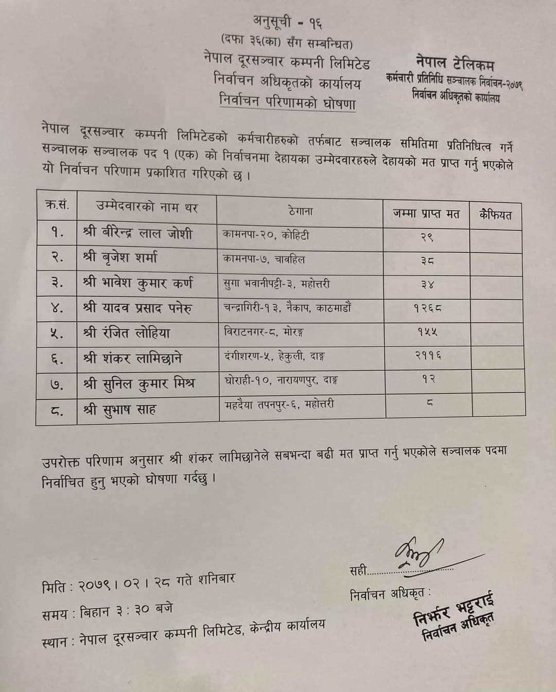 उक्त पदका लागि आठ जनाले उम्मेदवारी दिएका थिए । त्यसमध्ये लामिछाने सर्वाधिक २१ सय १६ मत प्राप्त गर्दै विजयी भएका हुन् ।