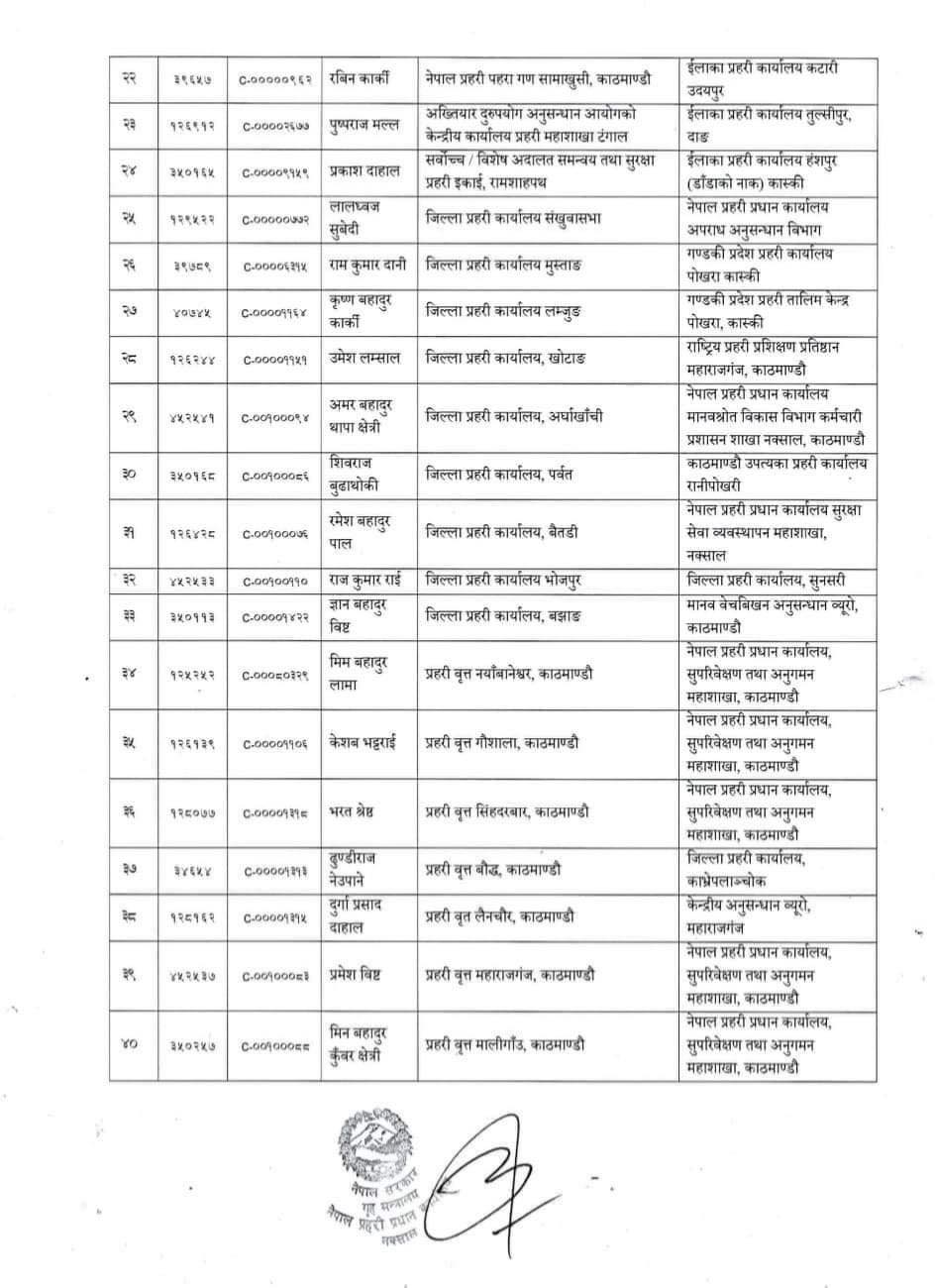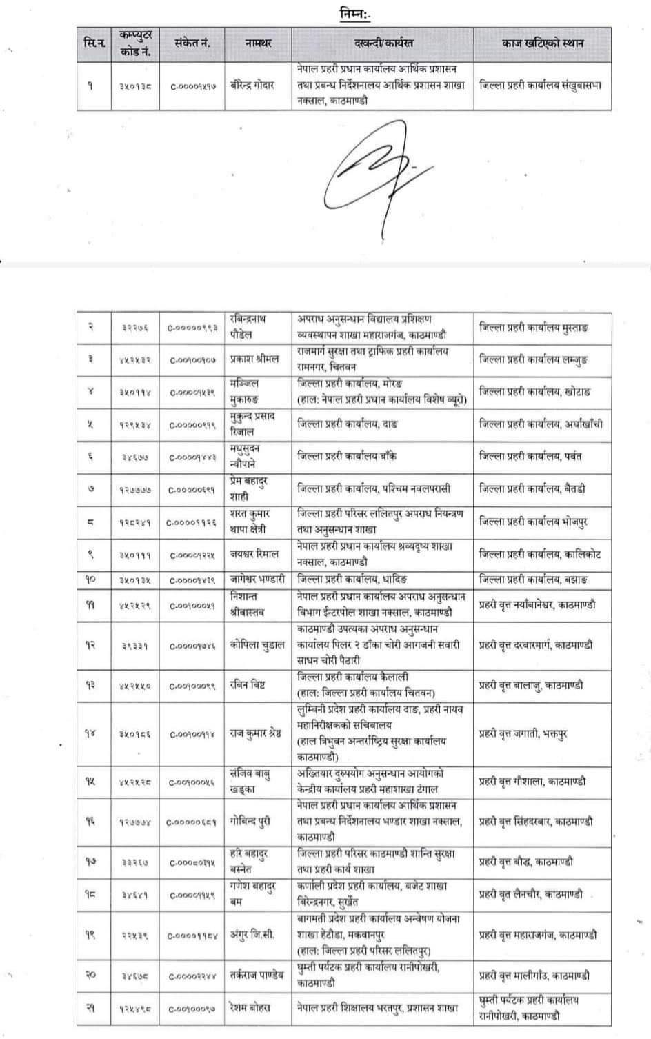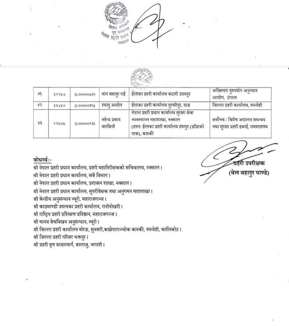 प्रहरी वृत्त बानेश्वरमा निशान्त श्रीवास्तव, दरबारमार्गमा कोपिला चुडाल, बालाजुमा रबिन विष्ट, जगातीमा राजकुमार श्रेष्ठ, गौशालामा सञ्जीवबाबु खड्का सरुवा भएका छन् ।