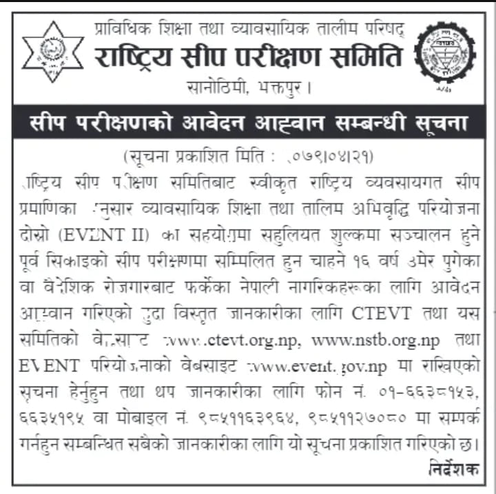 साउन २२, भक्तपुर | प्राविधिक शिक्षा तथा व्यवसायिक तालिम परिषद् (सीटीईभीटी)अन्तर्गतको राष्ट्रिय सीप परीक्षण समिति सानोठिमीले उड कार्भिङ व्यवसायीको सीप परीक्षण गर्ने भएको छ । समितिले सूचना प्रकाशित गरी उड कार्भिङलगायतका व्यवसायको सीप परीक्षण गर्ने जानकारी गराएको हो ।