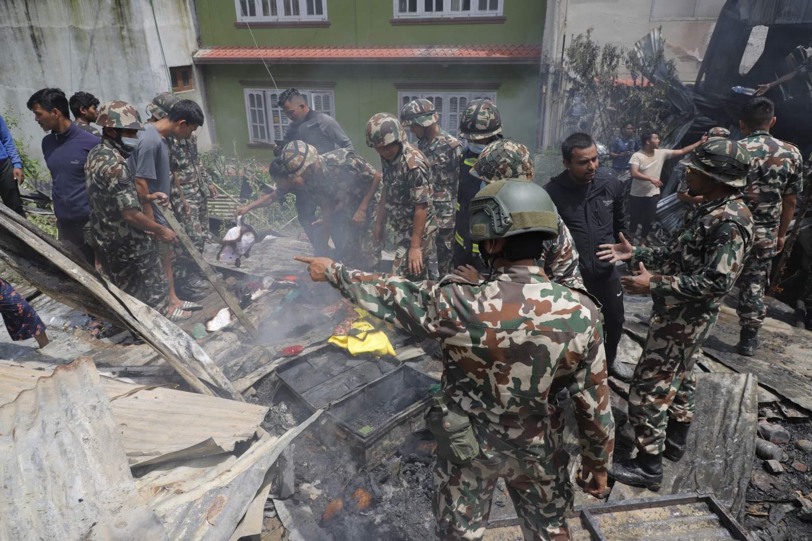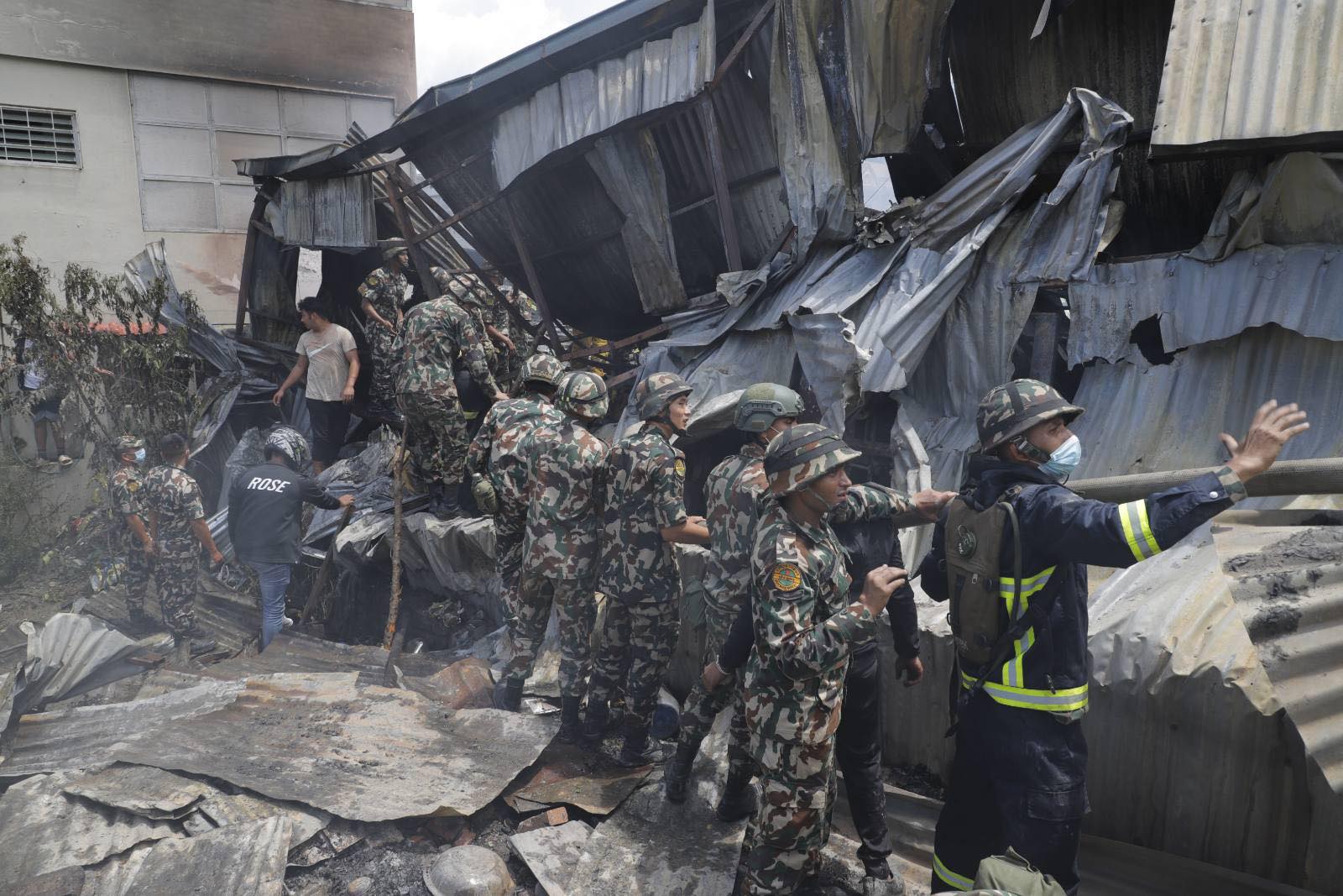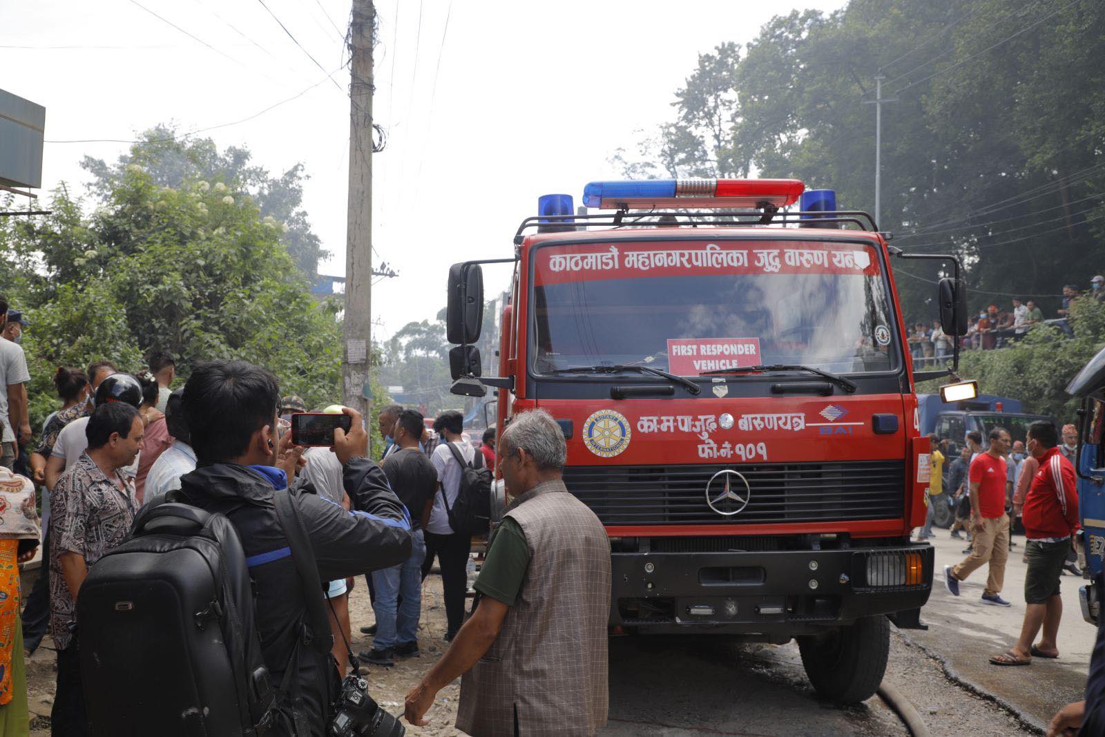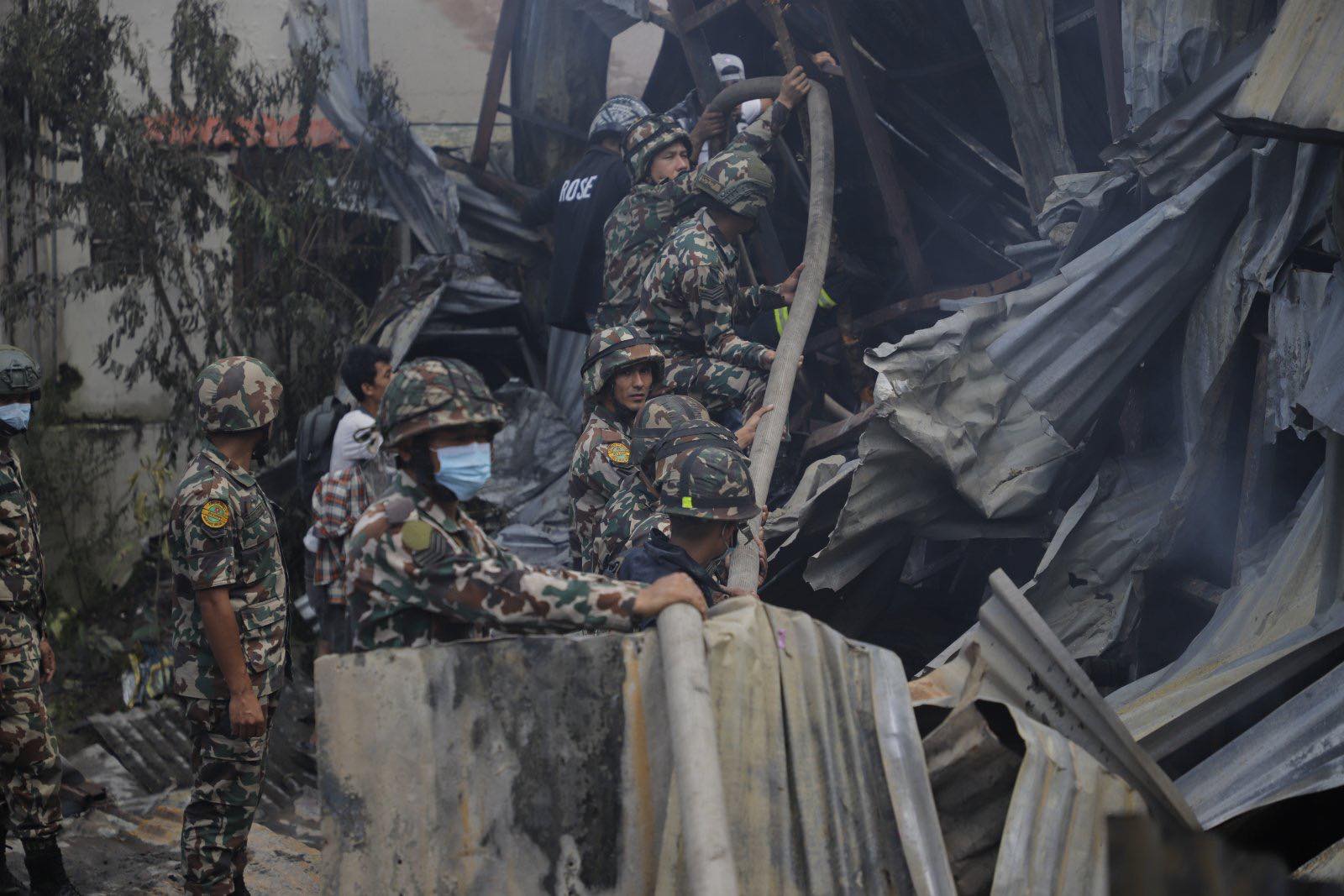 साउन २५, काठमाडौँ | काठमाडौँ महानगरपालिका–१६ बालाजु बाइपास नजिकको जुत्ता कारखानामा बुधबार बिहानदेखि लागेको आगो नियन्त्रण गर्दै अग्नी नियन्त्रक र सुरक्षाकर्मीहरू । घण्टौंको प्रयासपछि आगो नियन्त्रणमा आएको थियो ।