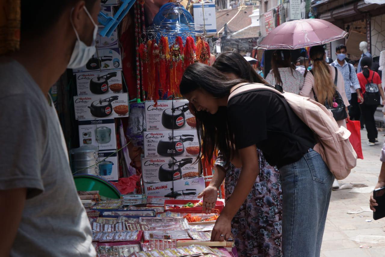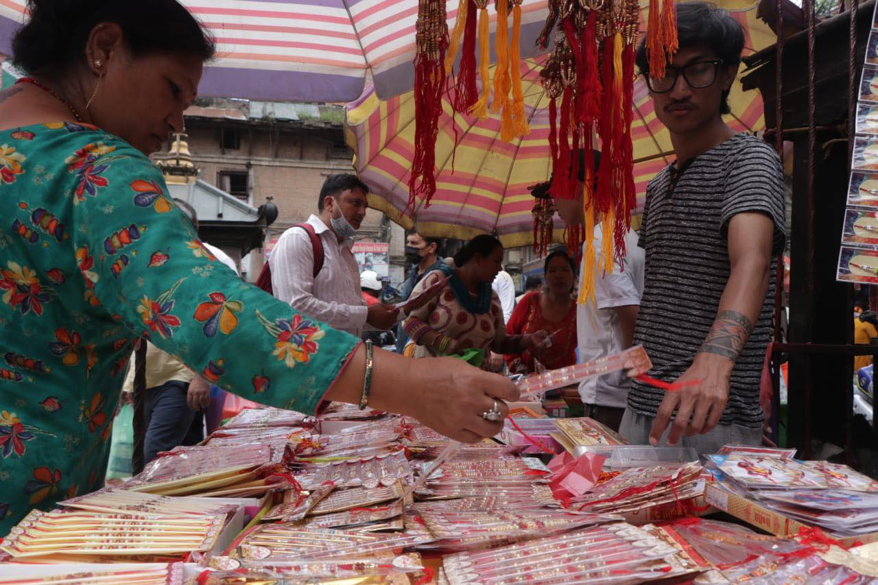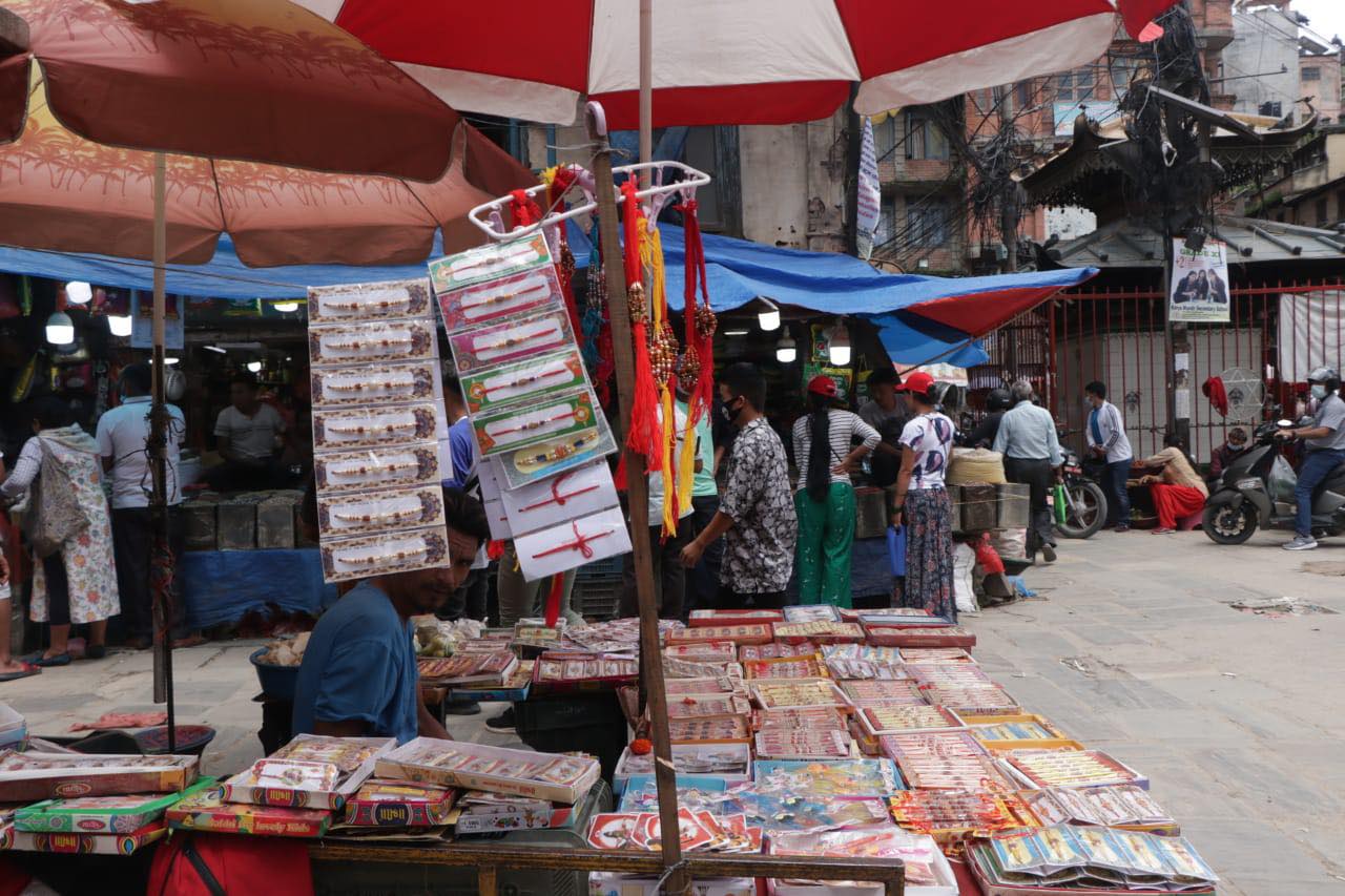 साउन २६, काठमाडौँ । काठमाडौंका प्रमुख बजारहरूमा रक्षाबन्धनको अघिल्लो दिन बिहीबार सामान्य दिन भन्दा भिडभाड देखिएको छ । रक्षाबन्धनका लागि आवश्यक सरसामान किनमेल गर्नेहरूका कारण बजारमा भिड बढेको हो । काठमाडौंका न्यूरोड, असन, इन्द्रचोक, नयाँ बानेश्वर, चाबहिल लगायतबजारमा बिहानैदेखि विशेष चहलपहल छ ।