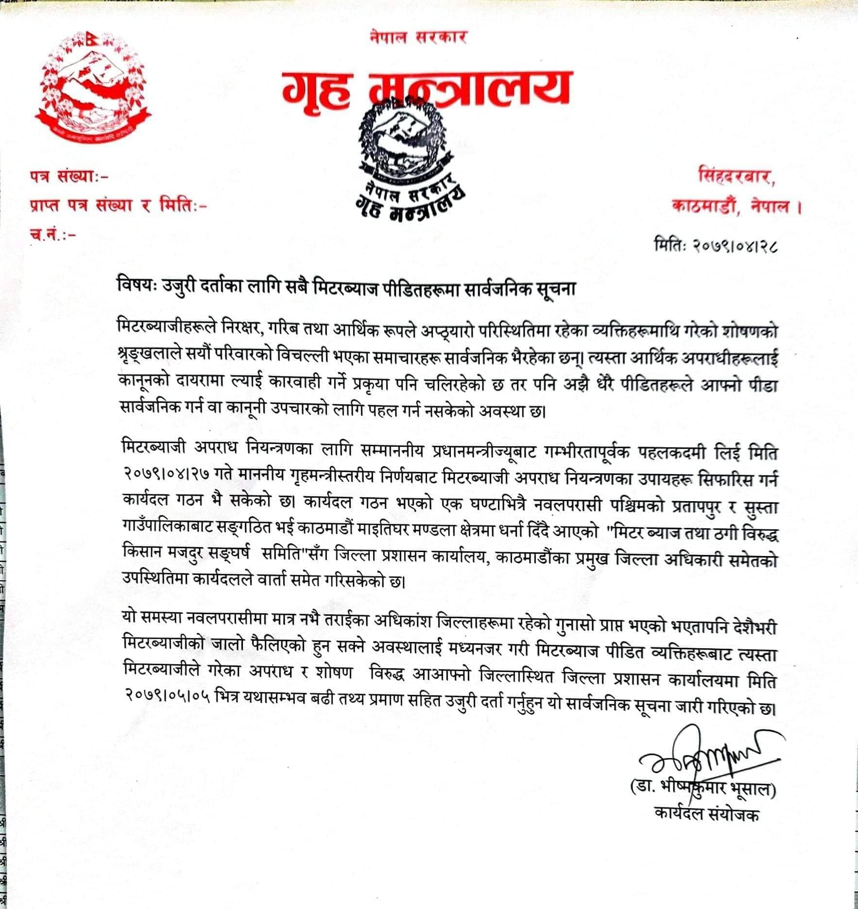 साउन २८, काठमाडौँ | विशेषगरी तराईका जिल्लाहरूमा केही समययता मिटरब्यजका कारण पीडित हुनु परेको घटना सार्वजनिक भएको भन्दै गृह मन्त्रालयले आगामी ५ भदौभित्र त्यस्ता पीडितहरूलाई प्रमाणसहित प्रहरीमा उजुरी गर्न सूचना जारी गरेको छ ।