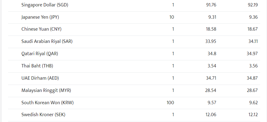 त्यस्तै, अष्ट्रेलियन डलर एकको खरिद दर ८९ रुपैयाँ ०१ पैसा र बिक्री दर ८९ रुपैयाँ ४३ पैसा, जापानिज येन १० को खरिदमा ९ रुपैयाँ ३१ पैसा र बिक्रीमा ९ रुपैयाँ ३६ पैसा, साउदी अरेवियन रियाल एकको खरिद दर ३३ रुपैयाँ ९५ पैसा र बिक्री दर ३४ रुपैयाँ ११ पैसा र कतारी रियाल एकको खरिद दर ३४ रुपैयाँ ८० पैसा र बिक्री दर ३४ रुपैयाँ ९७ पैसा रहेको छ ।