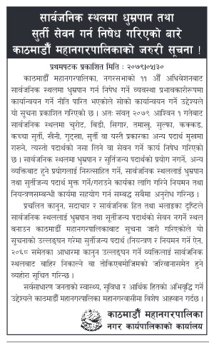 कानुन, सदाचार र सार्वजनिक हित तथा भलाइका हिसाबले काठमाडौं महानगरपालिकालाई धुम्रपान तथा सुर्तीजन्य पदार्थमुक्त क्षेत्र बनाउनको लागि जारी भएको सूचना अटेरी गर्नेलाई कारबाही र जरिबाना तिराइनेसमेत सूचनामा उल्लेख छ ।