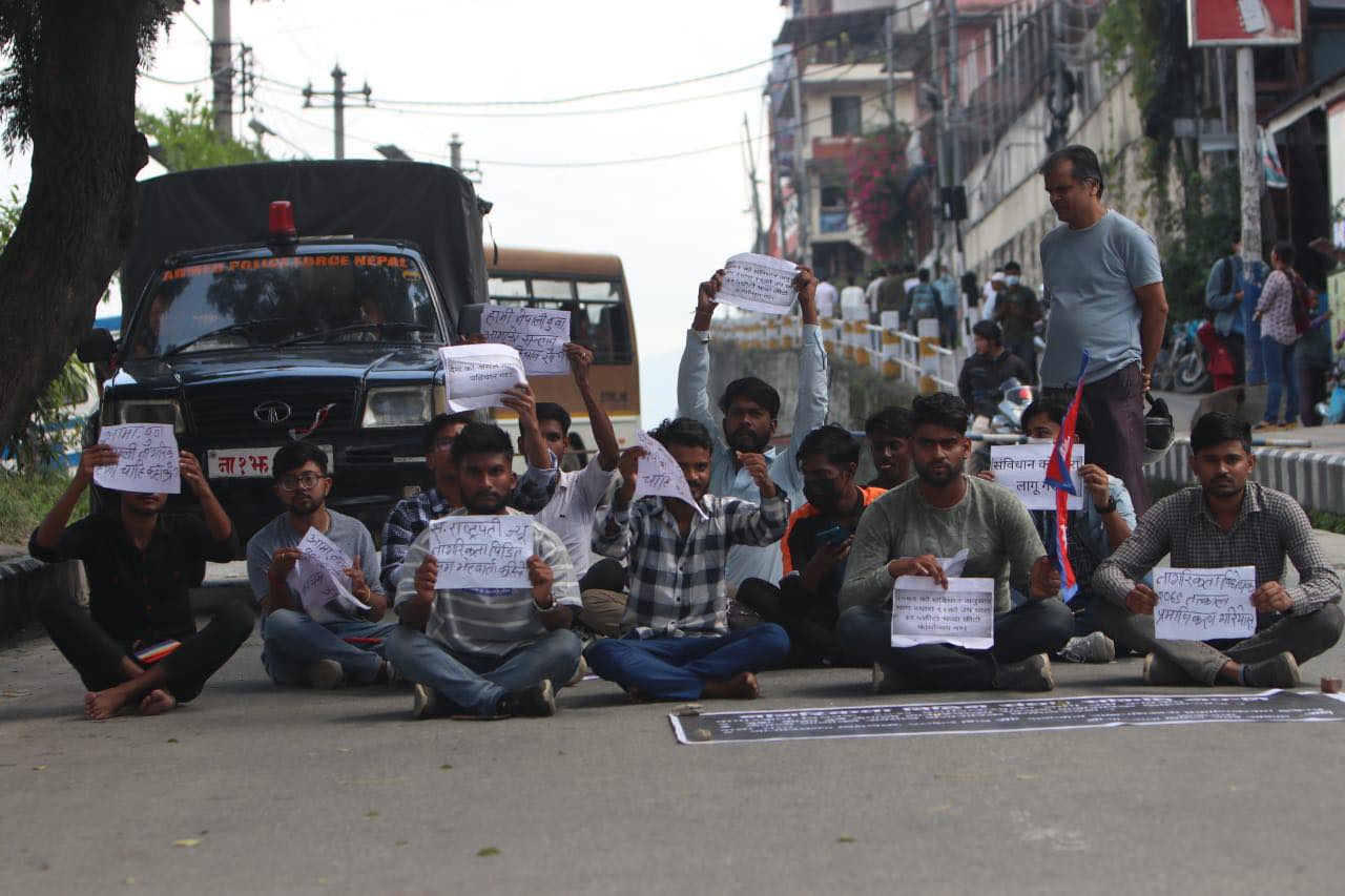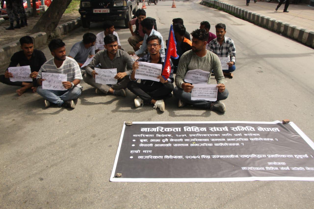 ‘बुबाआमा दुवै नेपाली नागरिकका सन्तान अनागरिक कहिलेसम्म ? नेपाली आमाको सन्तान अनागरिक कहिलेसम्म ?’ जस्ता ब्यानरर प्लेकार्डसहित समितिले धर्ना दिएको छ ।