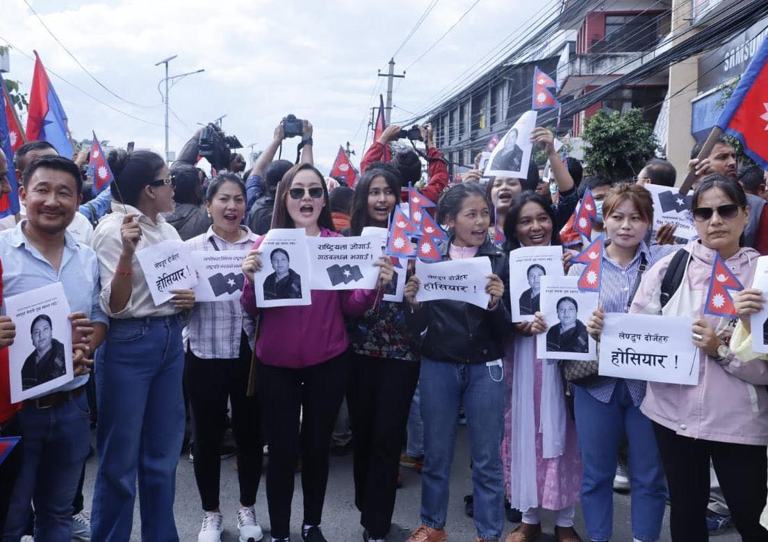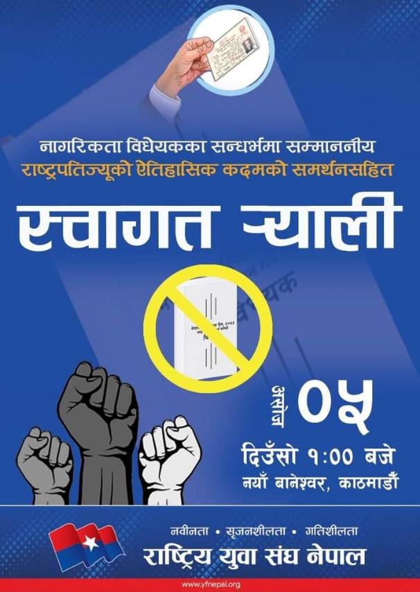 असोज ५, काठमाडौं | संसदबाट दोस्रो पटक पारित गरी प्रमाणीकरण गर्न राष्ट्रपति समक्ष पठाएको नागरिकता विधेयक फिर्ता गरेकोमा प्रतिपक्ष दल नेकपा एमालेको भातृ संगठन युवा संघ नेपालले काठमाडौंको बानेश्वरमा निकालेको स्वागत र्याली । संघले राष्ट्रपतिको कदमलाई ऐतिहासिक कदमको संज्ञा दिएको छ ।