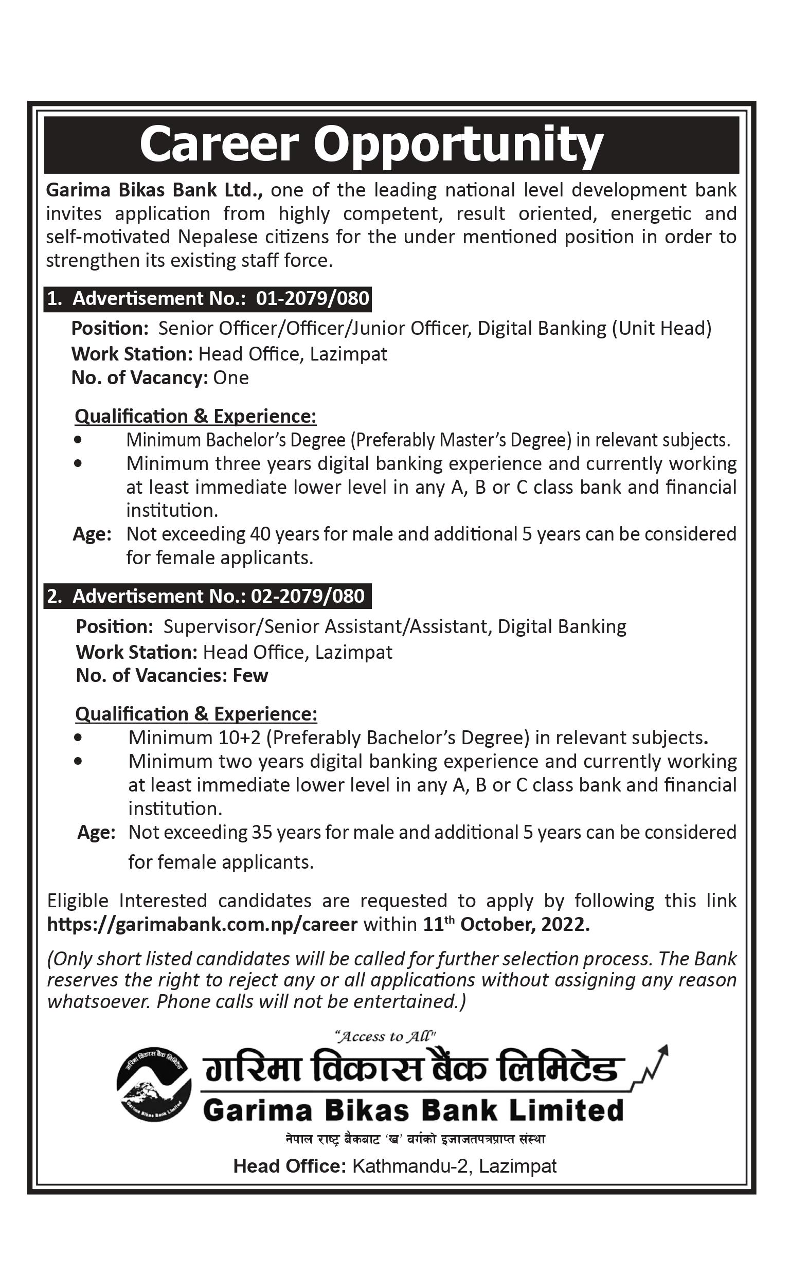 इच्छुक उम्मेदवारले बैंकको वेबसाइट https://www.garimabank.com.np/ मार्फत आवेदन दिन सक्नेछन् ।