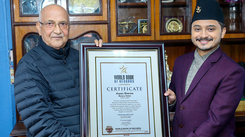 पूर्वप्रधानमन्त्री एवम नेकपा एमालेका अध्यक्ष केपी शर्मा ओलीले उनलाई बधाइ दिँदै नयाँ विश्व कीर्तिमानको प्रमाणपत्र हस्तान्तरण गरेका छन् । १ मिनेटमा ८३ वस्तुहरुको क्रम स्मरण गरेर उनले उक्त कीर्तिमान कायम गरेका हुन् ।