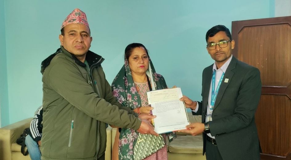 कास्कीको पोखरा उपमहानगरपालिका–१७ की बिमित संगिता शाहीको पोखरामा यती एयरलाइन्सको  जहाज दुर्घटनामा असामायिक निधन भएको थियो । बालाजु शाखामा आयोजित कार्यक्रमबीच मृतकले इच्छाएको व्यक्ति आमा कोपिला घर्ति क्षेत्रीलाई १ करोड १ लाखको चेक हस्तान्तरण गरिएको छ ।