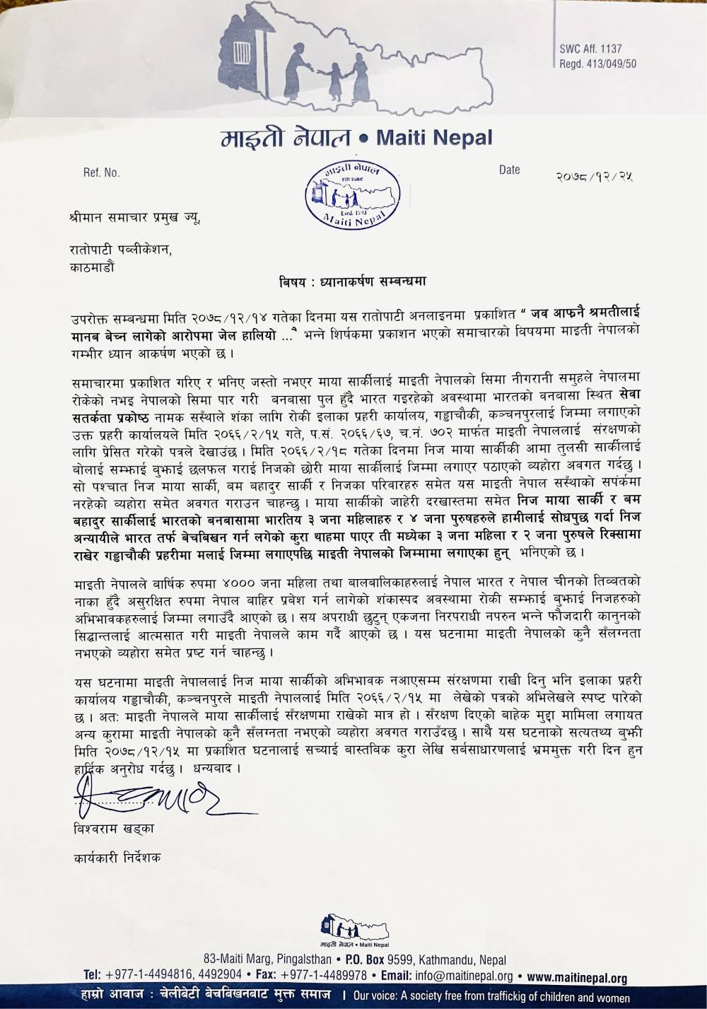 सोही समाचारका कारण माइती नेपालको भूमिकाप्रति भ्रम उत्पन्न भएको भन्दै चैत २५ गते माइती नेपालको तर्फबाट ध्यानाकर्षण भएको हो । ध्यानाकर्षणमा ती युवतीलाई आफूहरुले नियन्त्रणमा लिएको नभई गड्डाचौकी प्रहरी कार्यालयले जिम्मा लगाएको बताएको छ । उक्त घटनाका सम्बनधमा आफूहरुले मुद्दाको उठान नगरेको र गलत परामर्श नदिएको स्पष्टोक्ति माइती नेपालले दिएको छ । माइती नेपालले महिलालाई संरक्षण मात्रै दिएको तर मुद्दा मामिलाका सन्दर्भमा आफूहरुको कुनै संलग्नता नभएको संस्थाले जनाएको छ ।