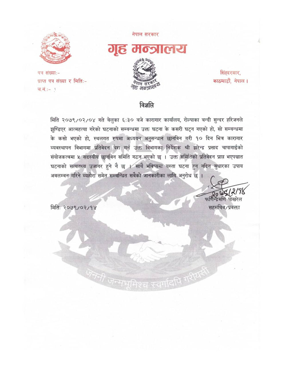 जेठ १४, काठमाडौं | गृह मन्त्रालयले रोल्पा कारागारमा बन्दी सुन्दर हरिजनले झुन्डिएर आत्महत्या गरेको घटनाबारे छानविन गर्न एक कार्यदल गठन गरेको छ । हरिजनको मृत्युबारे छानबिन गर्न पाँच सदस्यीय समिति गठन गरेको गृह मन्त्रालयले जनाएको छ ।